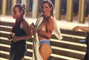 Во опуштено издание и видливо расположена, 38-годишната пејачка скокнала во брановите, но се чини дека во брзањето не го понела горниот дел од костим за капење со себе. Папараците ја снимиле додека излегувала од водата, завиткана само во пешкир, а фотографиите брзо ги обиколија светските медиуми.