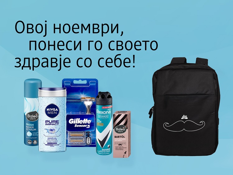 Во духот на Movember, dm ви подготви едно изненадување од 16.11.2025 до 30.11.2025 односно до истек на залихите, со секоја сметка над 999 денари за производи за нега на мажи, на каса добивате уникатен ранец, достапен во сите dm дрогерии низ земјата.