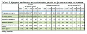 Анализирано според намената на кредитите одобрени на физичките лица, кај потрошувачките кредити, како најзастапена категорија, е остварен месечен пад од 0,2 % при годишен раст од 10,7 %, а станбените кредити се зголемени за 0,7 и за 16,1 % на месечно и на годишно ниво.
