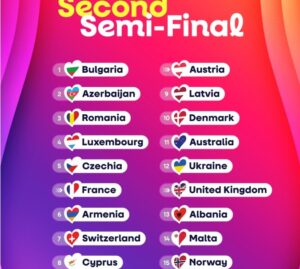 Бугарија и Азербејџан ќе го отворат второто полуфинале, по што следат Романија, Луксембург и Чешка, како и Франција.