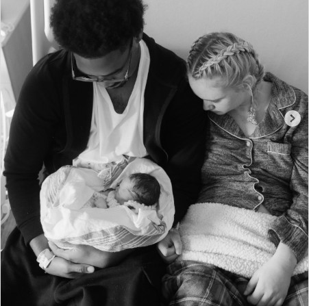 На црно-белите фотографии, Јангер и нејзиниот сопруг го држат бебето Арја покрај доктор во болница.