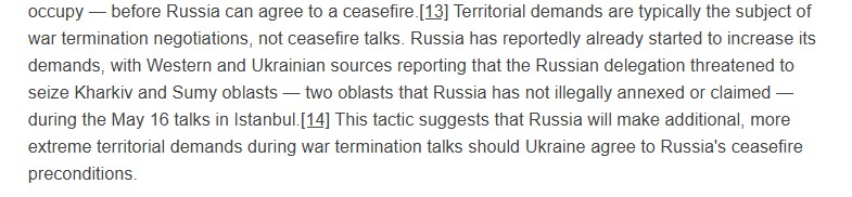Според институтот ИСВ, доколку Украина се согласи на прекин на огнот, Москва веројатно ќе бара дополнителни отстапки за регионите Суми и Харков и тоа токму во моментот кога Киев ќе биде во слаба позиција.