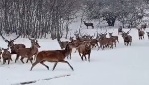 Стадо европски елени во репродуктивниот центар на Националниот парк Галичица плени со својата глетка низ свежо паднатиот снег, уште еднаш покажувајќи го успехот на зачувувањето на видот.