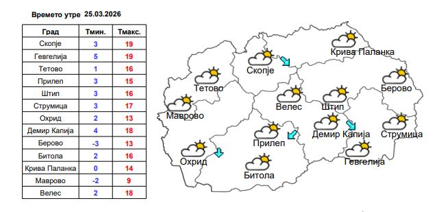Во Скопје утре времето ќе променливо облачно. Ќе дува слаб до умерен ветер од северен правец. Температурата ќе се движи од 3 степени наутро, до 19 степени преку денот.