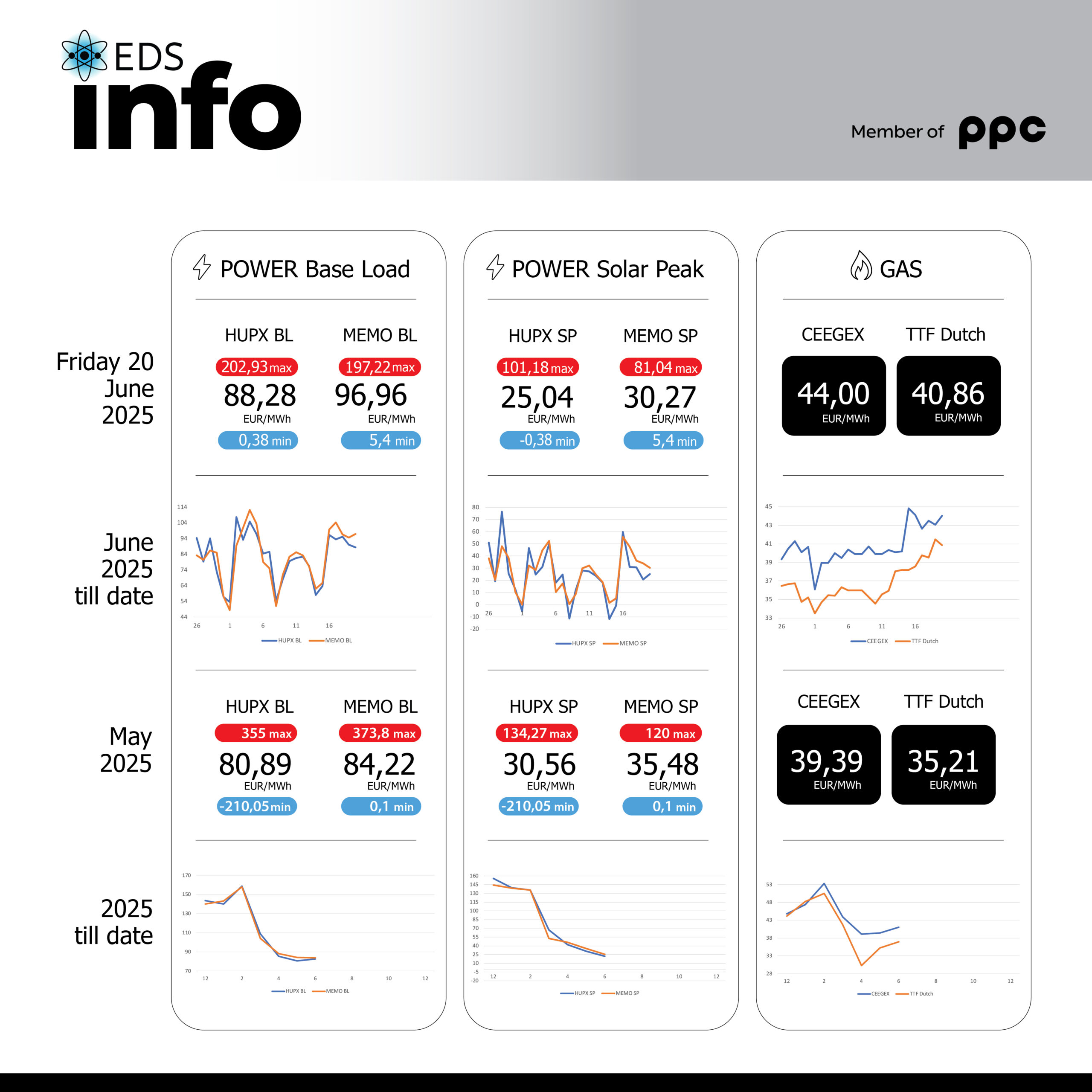 Согласно податоците за движењето на цените на берзата HUPX во Унгарија за 20 јуни просечната часовна цена на еден мегават час електрична енергија (baseload) изнесува 88,22 евра/mwh, додека на Македонската берза за електрична енергија цената е 96,96 евра/mwh, соопшти компанијата ЕДС Инфо поинт.