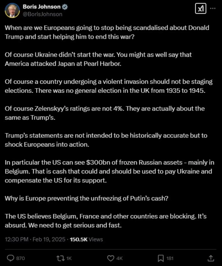 „САД можат да пристапат до 300 милијарди долари замрзнати руски средства – главно во Белгија. Тоа е готовина што треба и мора да се искористи за исплати кон Украина и за компензација на американската поддршка. Зошто Европа го спречува ослободувањето на парите на Путин? САД веруваат дека Белгија, Франција и други европски земји го блокираат овој процес. Тоа е апсурдно. Мораме да станеме сериозни и тоа брзо“, порача Џонсон.