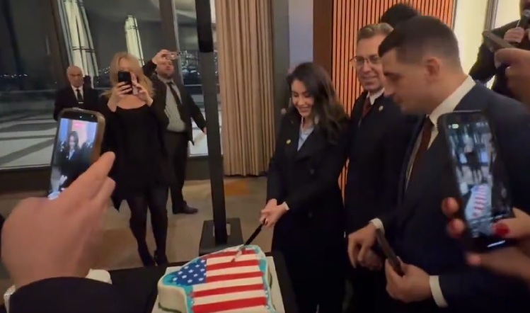 Во видео од настанот, може да се слушне како домаќинот им вели на гостите: „Дојдете овде, сликајте се и исечете ја тортата“. Тој ја опишува тортата како „51. држава“.