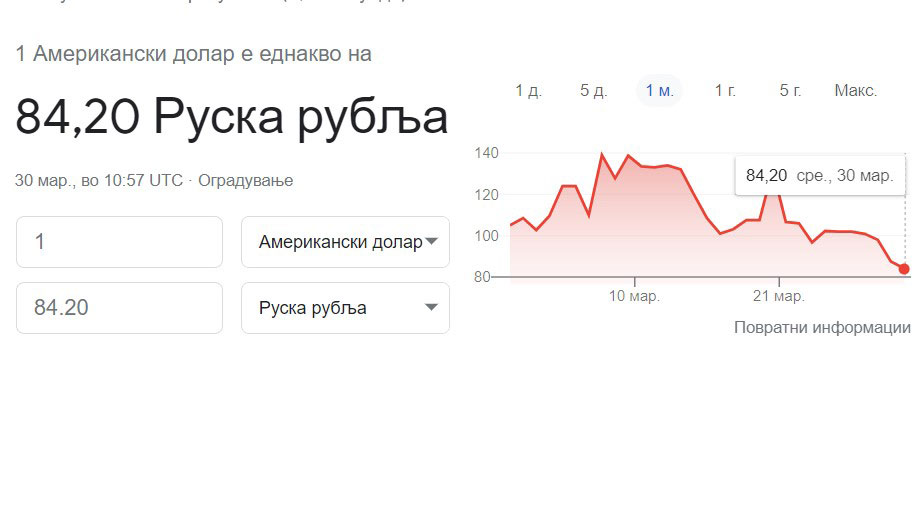 Денес е последен ден за рускиот гас да се плати во валута различна од рубљи, според неодамнешното барање на Владимир Путин кон европските земји. Неговата изјава и можниот страв од прекин на дотокот за Европа доведе рубљата повторно да се искачи за 10 отсто на светските берзи по првичниот пад од над 30 отсто кој следеше по санкциите од Западот кон Москва. Сепак, можеби главната причина за искачувањето се мировните преговори кои вчера покажаа напредок, пишува РусијаДенес.