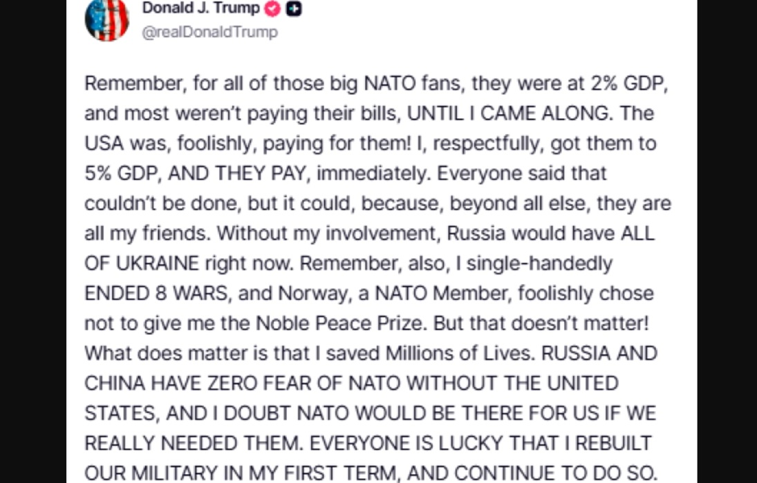 „Запомнете, за сите тие големи поддржувачи на НАТО: тие беа на 2% од БДП, а повеќето воопшто не ги плаќаа своите обврски – сè додека јас не се појавив. САД, глупаво, плаќаа за нив! Јас, со сета почит, ги натерав да одат на 5% од БДП И ТИЕ ПЛАЌААТ, веднаш. Сите велеа дека тоа не може да се направи, но можеше, затоа што, над сè, тие се сите мои пријатели. Без моето вмешување, Русија ќе ја имаше ЦЕЛА УКРАИНА во моментов. Запомнете и дека јас самостојно завршив 8 војни, а Норвешка, членка на НАТО, глупаво одлучи да не ми ја додели Нобеловата награда за мир. Но, тоа не е важно! Важно е тоа што спасив милиони животи. Русија и Кина воопшто не се плашат од НАТО без САД, а јас се сомневам дека НАТО би бил тука за нас. Сите се среќни што ја обновив нашата војска во мојот прв мандат и продолжувам да го правам тоа“, објави американскиот претседател Трамп.