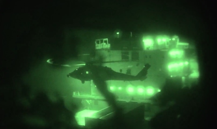 U.S. Marines depart amphibious assault ship USS Tripoli (LHA 7) by helicopter and transit over the Arabian Sea to board and seize M/V Touska. The Marines rappelled onto the Iranian-flagged vessel, April 19, after guided-missile destroyer USS Spruance (DDG 111) disabled Touska’s… pic.twitter.com/mFxI5RzYCS