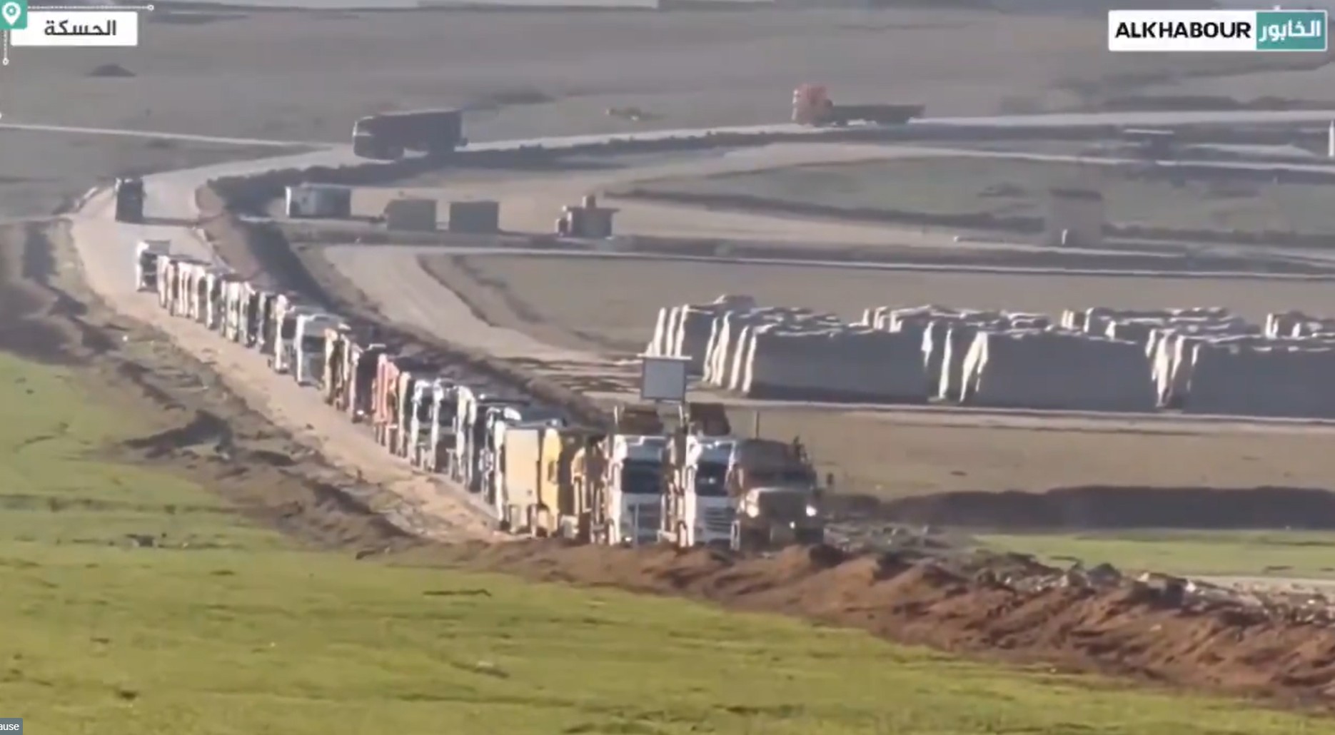 Според британски медиуми, кои се повикуваат на неименувани безбедносни извори, неколку десетици камиони, дел натоварени со оклопни возила, ја напуштиле базата во областа Хасака.
