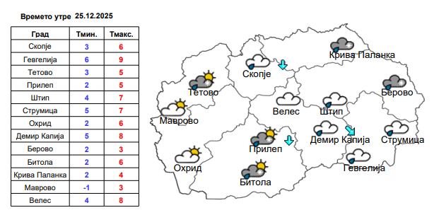 Во Скопје времето ќе биде облачно, претпладне со повремени врнежи од дожд. Ќе дува слаб до умерен ветер од северен правец. температурата ќе се движи од 3 до 6 степени.