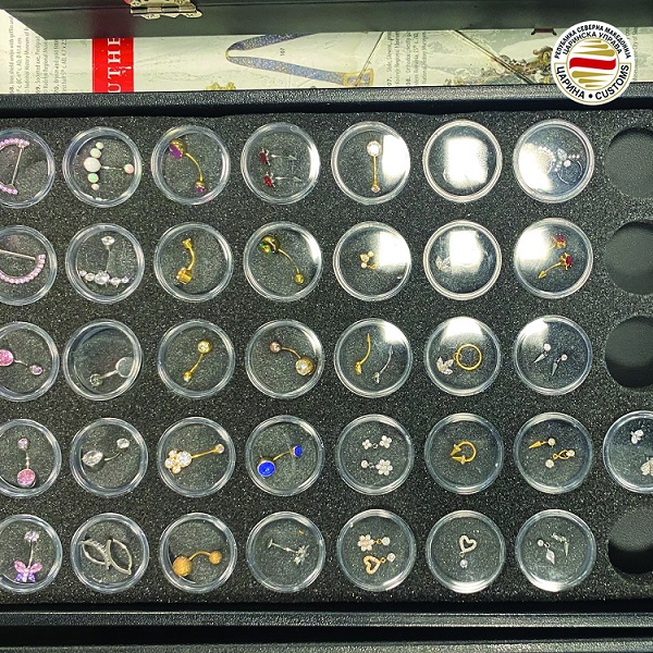 На Меѓународниот аеродром Скопје минатата недела е откриен и обид за криумчарење на 1.463 парчиња пирсинг од титаниум и опрема за тетовирање – 32 парчиња ножици и 70 парчиња игли за тетовирање, кои подлежат на посебни дозволи за увоз од надлежна институција. Сторителот на прекршокот е државјанин на Шпанија, кој патувал со лет Стокхолм – Скопје, со крајна дестинација Кипар. Непријавената стока е запленета, а против сторителот е поведена прекршочна постапка.
