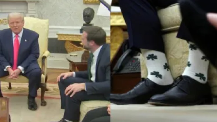 Овалната соба во средата беше сведок на неверојатен момент кога американскиот претседател Доналд Трамп го „чепна“ потпретседателот Џеј Ди Венс за зелено-белите чорапи што ги носеше за време на состанокот со ирскиот премиер Мајкл Мартин. Претседателот Трамп не можеше, а да не се насмее бидејќи за момент му го одвлекуваа вниманието чорапите на г-дин Венс со луда шема.