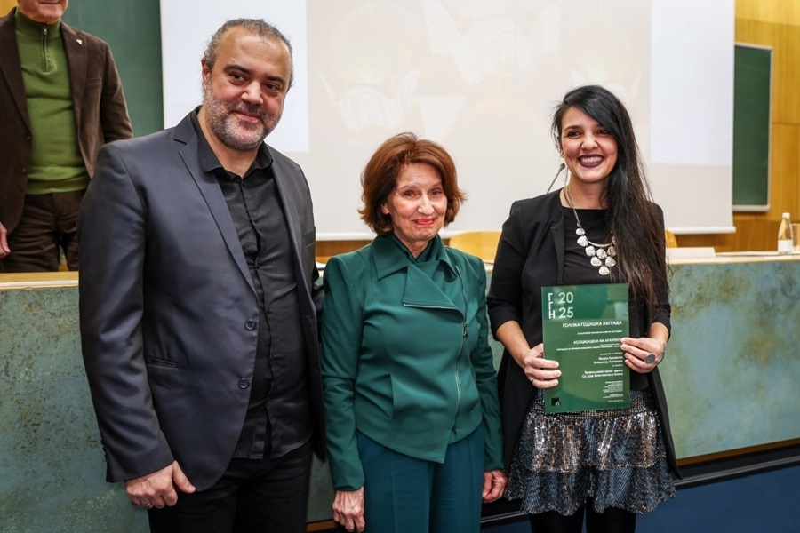 Претседателката Гордана Сиљановска-Давкова синоќа ја врачи Големата годишна награда за најуспешно реализирано архитектонско дело во 2025 на авторите Искра Лековска и Владимир Лековски од архитектонското студио „Лелелеле“, за проектот Православен храм – црква „Св. Рамноапостоли цар Константин и царица Елена“ во Скопје.