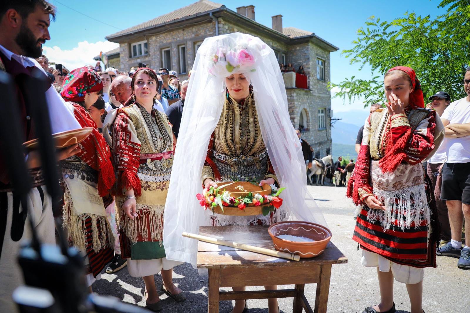 Вчерашното поставување на свадбарскиот бајрак и симболичниот чин на „фрлање” пушка од куќата на зетот и годинава го означија почетокот на свадбата. По венчавањето на младенците во храмот „Св. апостоли Петар и Павле”, продолжи одржувањето на свадбените обичаи.