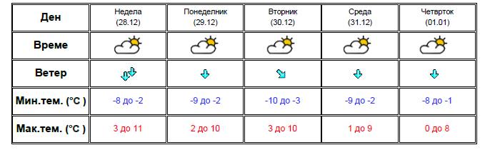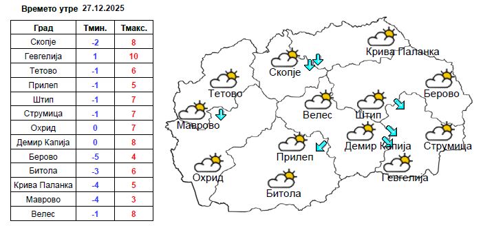 Температурата ќе се спушти најниско во Берово, каде утринската ќе изнесува минус 5, а најтопло ќе биде во Гевгелија, каде дневната ќе се искачи до 10 степени Целзиусови.
