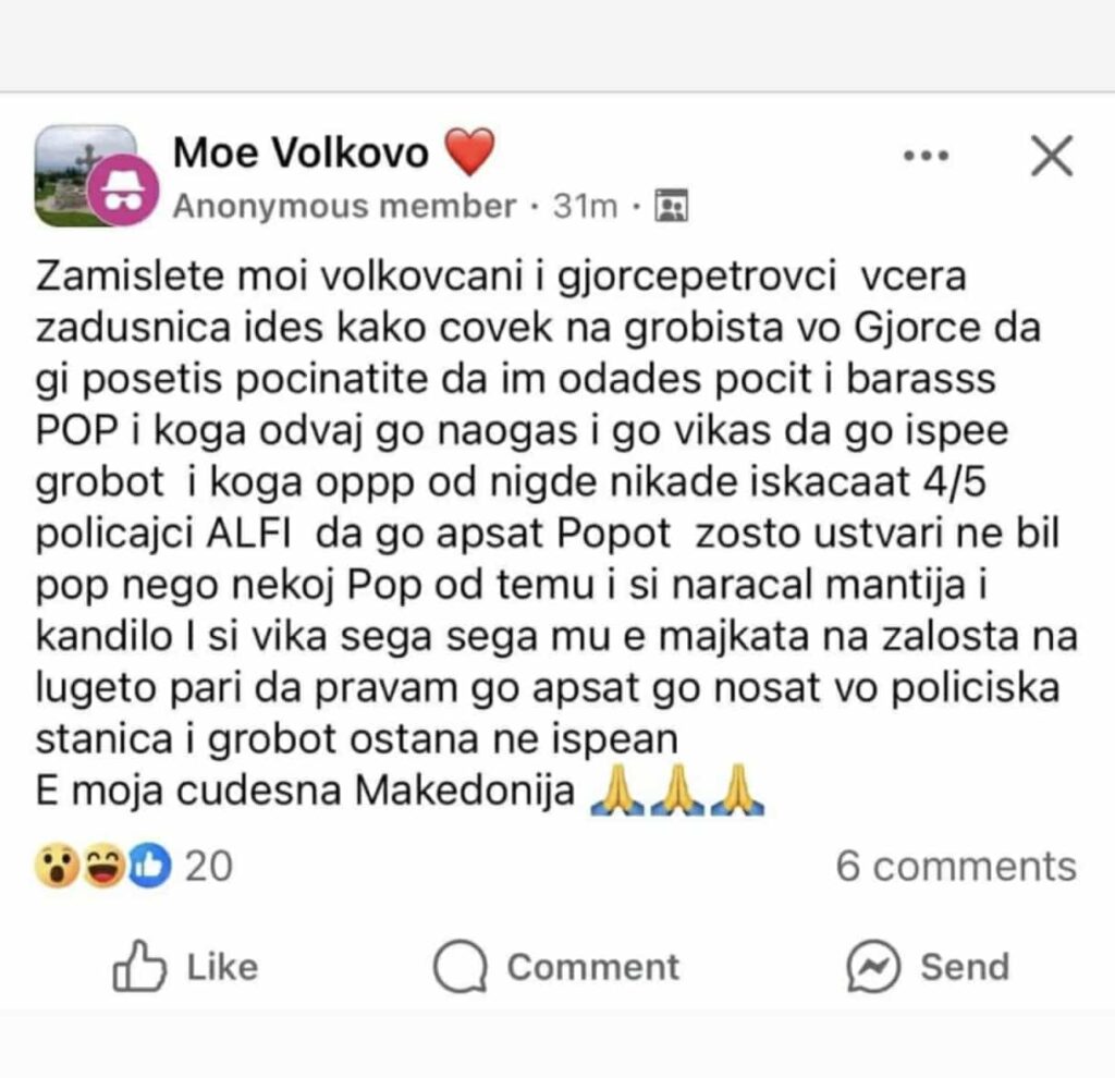 „Замислете мои волковчани и ѓорчепетровци, на Задушница одиш како човек на гробишта за да ги посетиш починатите и бараш поп. И кога едвај го наоѓаш, го викаш да го испее гробот, и оп – од нигде никаде скокаат четворица полицајци да го апсат попот. Зошто? Затоа што не бил поп, туку некој човек што си нарачал мантија и кандило и си рекол: ‘Сега ќе му е мајката, на жалоста на луѓето пари ќе правам’. Го апсат, го носат во полициска станица, а гробот остана неиспеан. Е моја чудесна Македонија“, напиша еден корисник на Фејсбук.