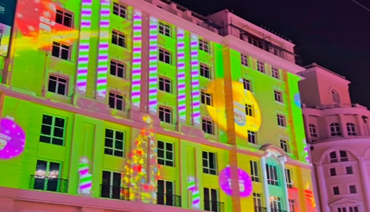Плоштадот „Македонија“ вечеравечер се претвори во вистинска празнична сцена, откако недовршената зграда во самиот центар на Скопје блесна во разни бои и динамични визуелни прикази, носејќи новогодишна и божиќна еуфорија меѓу граѓаните и посетителите.