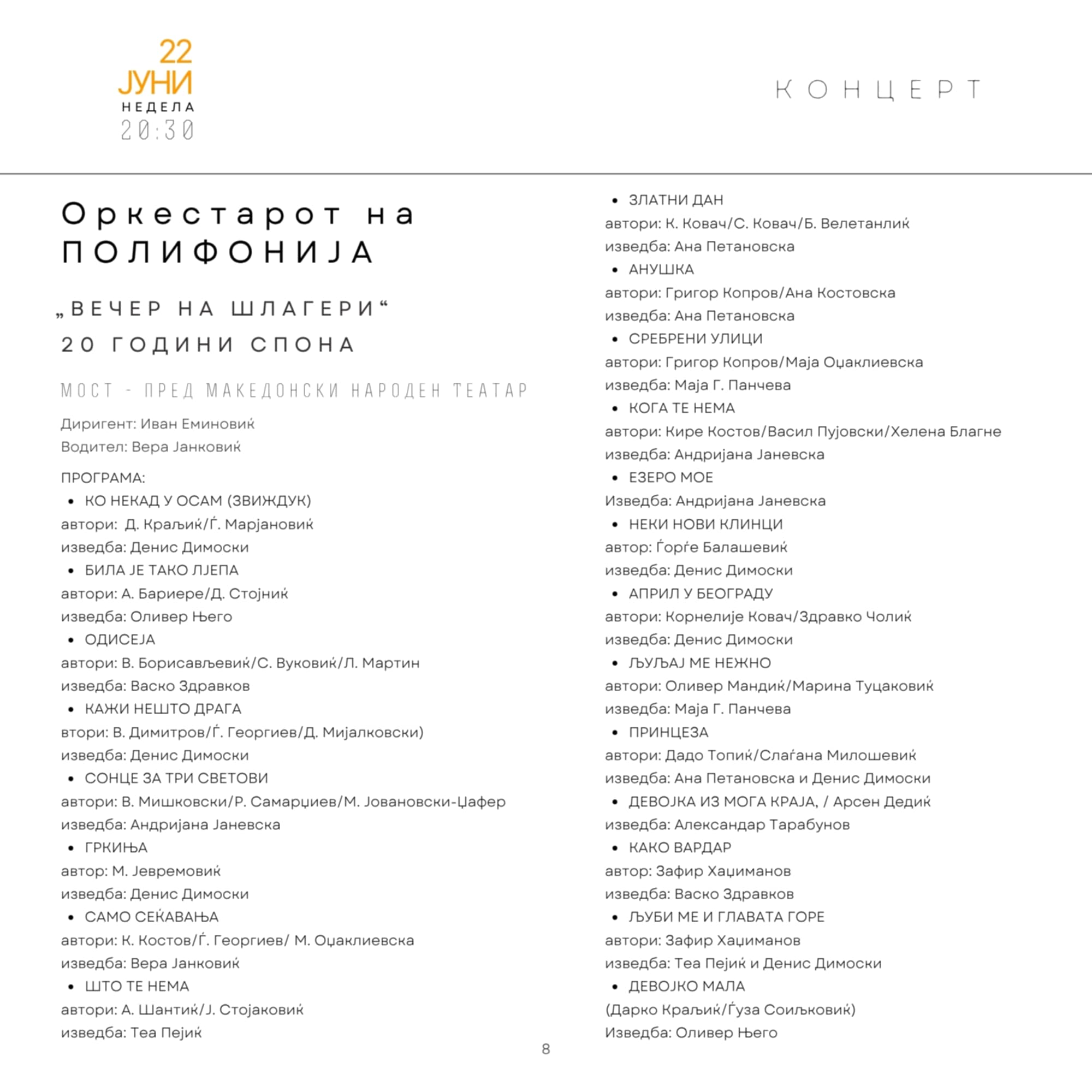 На сцената ќе настапат Оркестарот на „Полифонија”, а изведувачи се Денис Димоски, Оливер Њего, Васко Здравков, Андријана Јаневска, Вера Јанковиќ, Теа Пејиќ, Ана Петановска, Маја Г. Панчева и Александар Тарабунов.