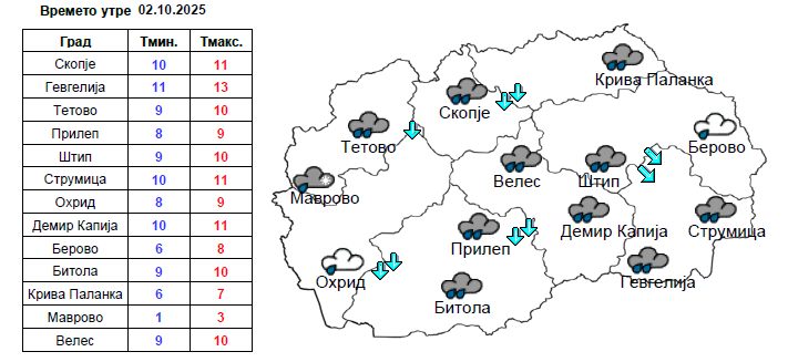 Во Скопје утре времето ќе биде облачно и студено со врнежи од дожд, повремено пообилни. Ќе дува умерен до засилен ветер од северен правец. Температурата ќе достигне до 11 степени Целзиусови.