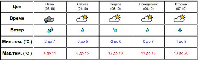 Под влијание на влажен и студен бран до петок времето ќе биде облачно и студено со врнежи од дожд, кои наместа ќе бидат обилни. Поради продор на постудена воздушна маса од север и засилен северен ветер, утре на планините врнежите ќе преминуваат во снег, а поради натамошно спуштање на студен воздух, во петок ќе има услови да преминуваат во снег и на некои од повисоките места.