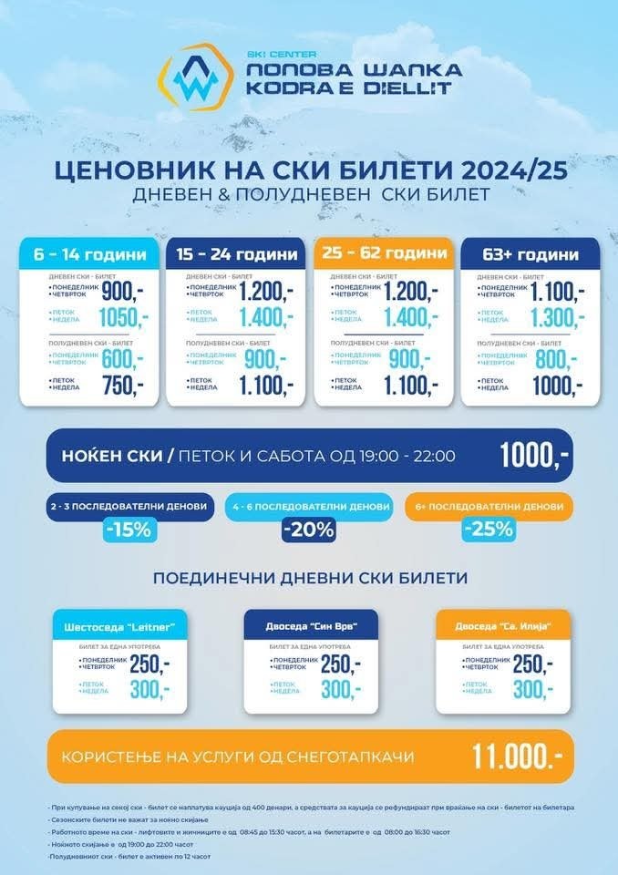 Од Ски Центар Попова Шапка информираат дека сите љубители на снегот и зимските спортови ќе можат да уживаат во новата сезона, при што ски-лифтовите ќе работат во периодот од 08:45 до 15:00 часот.