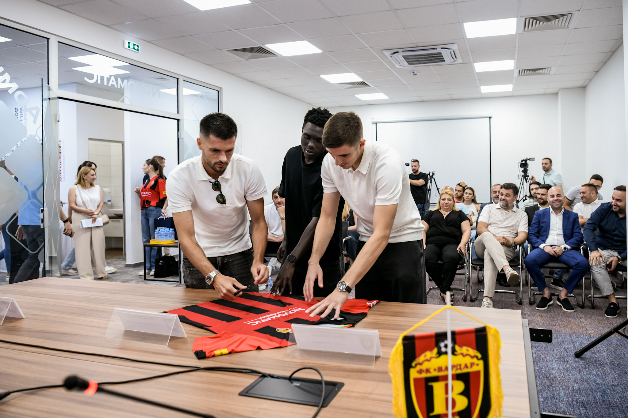 Фудбалските ѕвезди на Вардар присутни на настанот го потпишаа дресот на Вардар на кој стои натпис „Новоматик“.