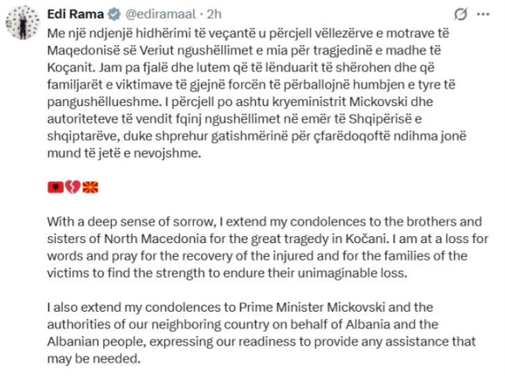 „Со длабоко чувство на тага им го пренесувам моето сочувство на браќата и сестрите од Северна Македонија за големата трагедија во Кочани. Кога ја дознав веста останав без зборови и се молам повредените да закрепнат а семејствата на жртвите да најдат сила да се справат со нивната неутешна загуба. Исто така, во име на Албанија и Албанците го пренесувам моето сочувство до премиерот Мицкоски и властите на соседната земја“, напиша Рама на социјалната мрежа Икс.