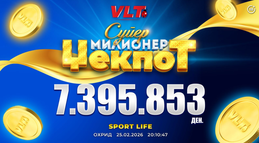 Охриѓанецот А.П. освои СУПЕР МИЛИОНЕР ЏЕКПОТОТ, вреден 7.395.853 денари. Најпосакуваната ВЛТ добивка е освоена со играта „40 Брнинг Хот”, на видеолотариските терминали кај деловниот соработник „Спортлајф”, на 25.02.2026 година, во Охрид.