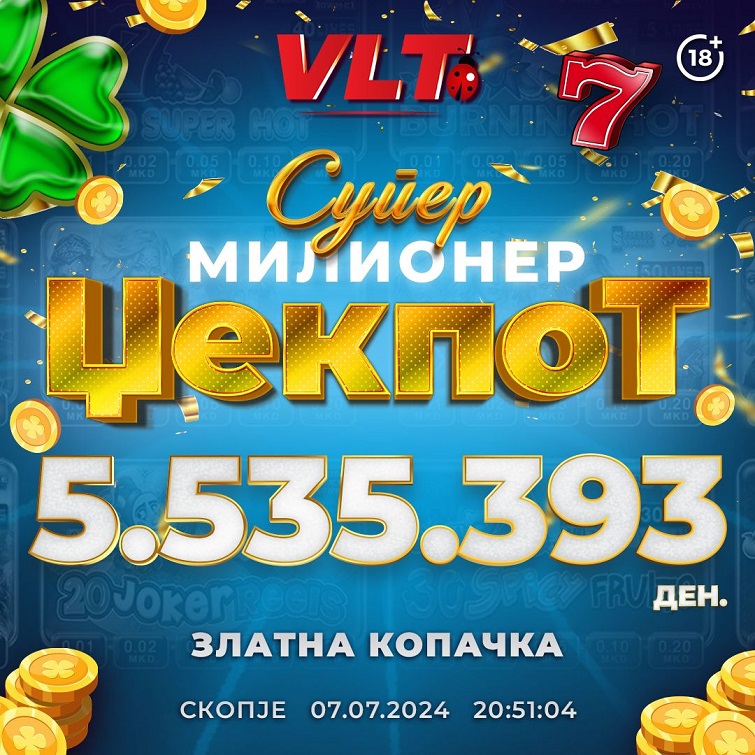 Јули започна и интензивно продолжува со убави вести. По првиот на 01.07.2024, овој месец веќе го имаме и вториот среќен добитник на најпосакуваниот џекпот на Видеолотарија Касинос Австрија, СУПЕР МИЛИОНЕР џекпот. На видеолотариските терминали кај нашиот соработник, Златна Копачка, играч од Скопје, освои 5.535.393 денари.