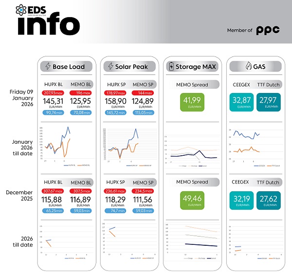 Согласно податоците за движењето на цените на берзата HUPX во Унгарија за 9 јануари 2026 просечната часовна цена на еден мегават час електрична енергија (baseload) изнесува 145,31 евра/mwh, додека на Македонската берза за електрична енергија цената е 125,95 евра/mwh.