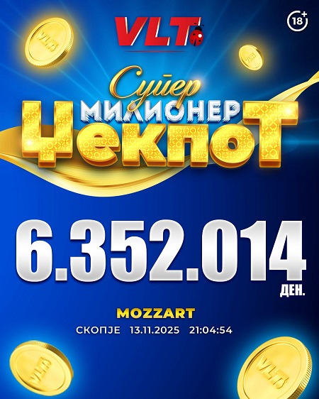 Во периодот од 03.11.2025 до 11.11.2025 Видеолотарија Касинос Австрија исплати 14.040.721 денари кон играчите на ВЛТ терминалите ширум Македонија. За 1 Супер милионер џекпот исплатени се 5.540.729 денари, за 4 Милионер џекпот добивки вкупно 6.616.593 денари и за добитници на Мини џекпот исплатени се 1.883.399 денари.