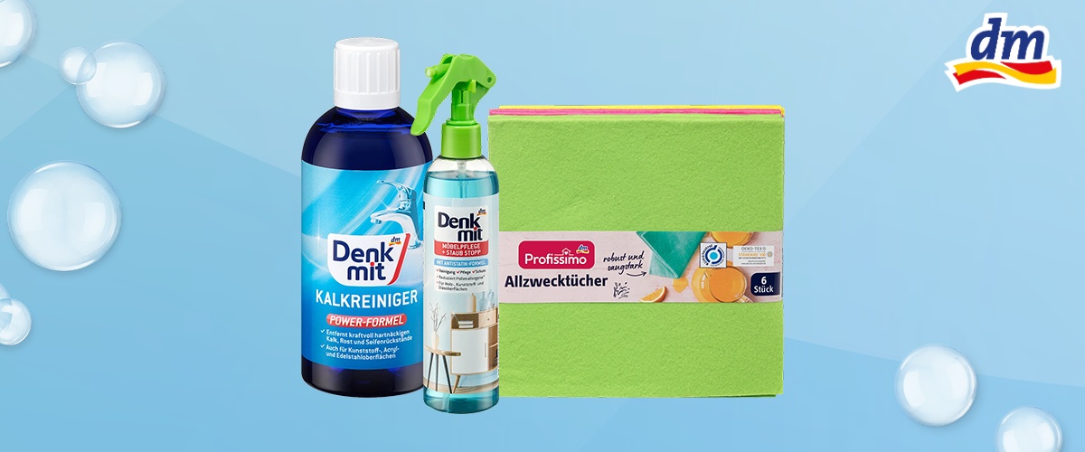 Со производите од Denkmit и Profissimo, пролетното чистење може да стане поедноставно, поефикасно и подобро организирано. Без разлика дали станува збор за кујната, бањата, прозорците, мебелот или текстилот во домот, во dm ве очекуваат практични решенија за чист и свеж дом, по секогаш поволни цени.