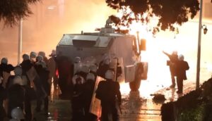 Молотови коктели и солзавец во центарот на Тирана, 21 приведен, повредени полицајци и запалено телевизиско возило.