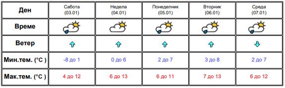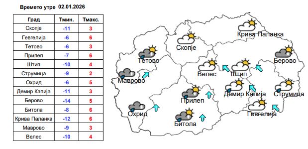 Во Скопје времето утре ќе биде променливо облачно со сончеви периоди и студено со умерен ветер од јужен правец. Утрото ќе биде студено, со минимална температура од минус 11 степени, а дневната ќе се искачи до 3 степени Целзиусови.