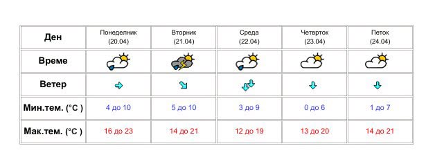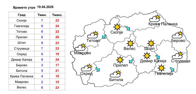Најстудено ќе биде во Маврово, каде утринската температура ќе се спушти до 2 степена. Најтопло ќе биде во Гевгелија и во Демир Капија со максимална дневна температура до 24 степени.