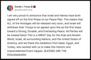 ТРАМП ОБЈАВИ ДЕКА ИЗРАЕЛ И ХАМАС ПОСТИГНАЛЕ ДОГОВОР Благословени да се миротворците, напиша претседателот на САД