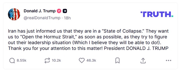 „Иран штотуку нè информираше дека е во состојба на колапс. Тие сакаат што поскоро да го отвориме Ормускиот Теснец, додека се обидуваат да ја решат ситуацијата со нивното лидерство (во што верувам дека ќе успеат!)“, објави тој.