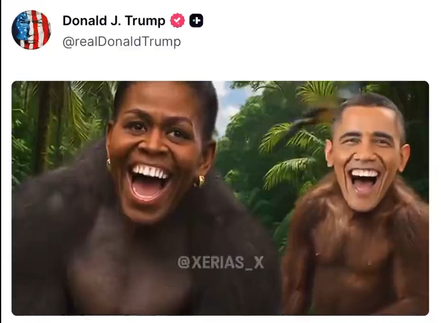 Претседателот Доналд Трамп објавил видео генерирано со вештачка интелигенција на својата мрежа „Truth Social“, во кое поранешниот претседател Барак Обама и неговата сопруга Мишел Обама се прикажани како мајмуни во џунгла. Кадрите се појавуваат кратко, околу една секунда, но доволно долго за да предизвикаат жестоки реакции.