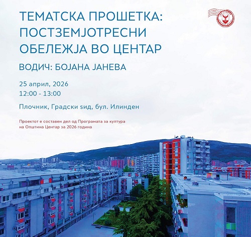 Темата на прошетката се постземјотресните обележја во Центар, а низ значајните локации водич ќе биде историчарката по уметност и кустос Бојана Јанева. Граѓаните ќе имаат можност да се едуцираат за Градскиот ѕид, Главната пошта, Градскиот трговски центар , Македонска академија на науките и уметностите и др.