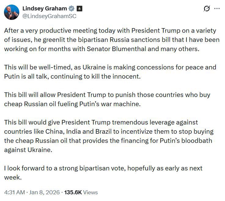 Зеленото светло за гласање санкции доаѓа токму на време, кога Украина прави заложби за мир, додека Путин само зборува додека убива невини луѓе, напиша на социјалните мрежи сенаторот Линдзи Греам, нагласувајќи дека гласањето би можело да се одржи веќе следната недела.недела.