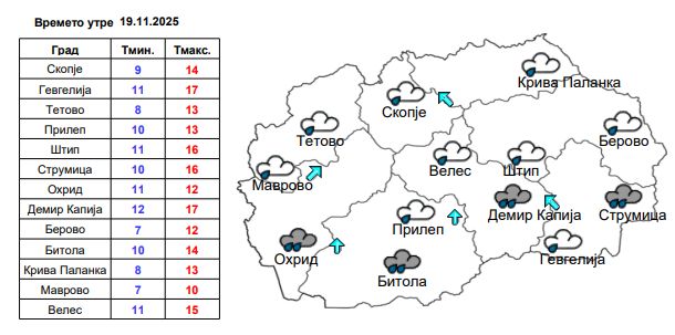 Ввремето утре ќе биде претежно облачно со повремени локални врнежи од дожд, особено претпладне во југозападните и во јужните делови. Ќе дува слаб до умерен ветер од јужен правец.