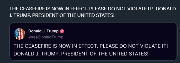 „Прекинот на огнот сега е на сила. Ве молам, не го прекршувајте! Доналд Џ. Трамп, претседател на Соединетите Американски Држави!“, напиша тој.