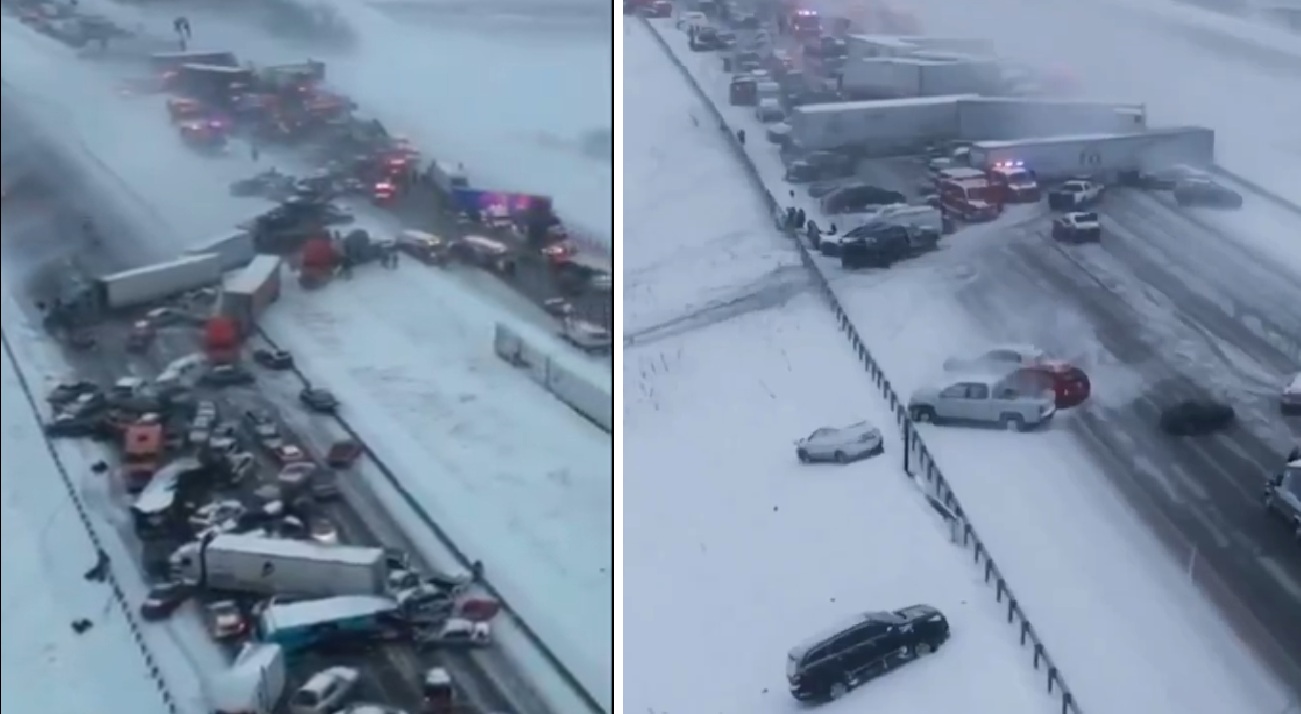 A massive and extremely terrifying multi-vehicle collision in #indiana, USA, following a heavy snowstorm, left multiple vehicles mangled and stranded on the icy highway, causing chaos and widespread disruption.#USA pic.twitter.com/nqj5HaKypO