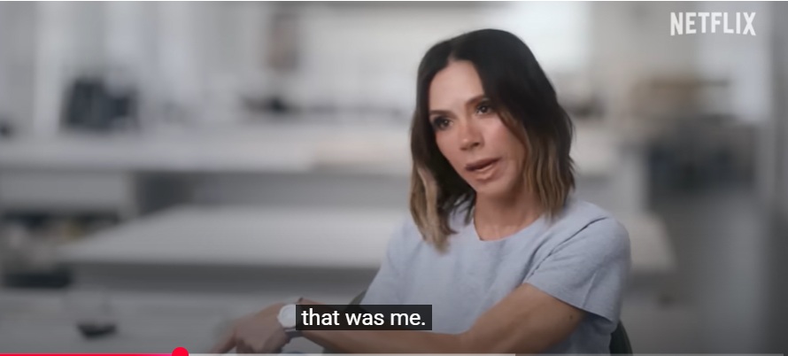 Во „Викторија Бекам“, таа објаснува: „Еве еден факт. Изгледав мизерно сите овие години затоа што кога стоиме на црвениот тепих, овој човек секогаш застанувал лево“, вели таа, осврнувајќи се на својот сопруг Дејвид Бекам.