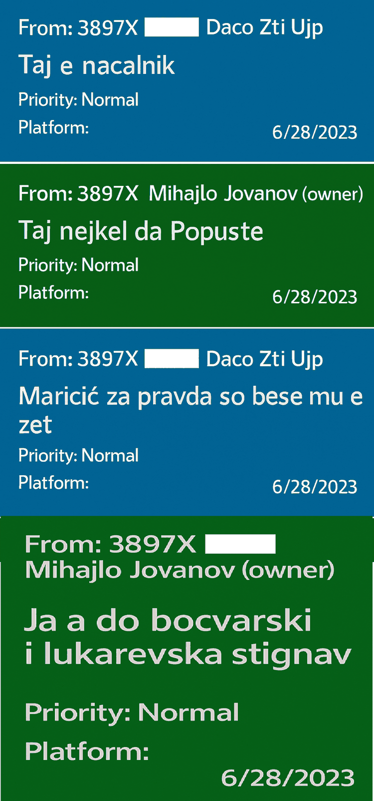 На 8 август 2023 година, Дацо му праќа нови пораки на Михаил. Во нив вели: „Оооо… брат, тие се вашите комуњари … хахахах“. Дацо му вели на Михаил дека и неговите биле „од режимот“, дека на сите им било добро со него (со Дацо) и со Дуле, дека они ретко некој пишале. Михаил одговара дека сега му било тешко без нив и му недостасувале и дека мирно била сега. Дацо му вели дека Деспина ја пишале поради него.