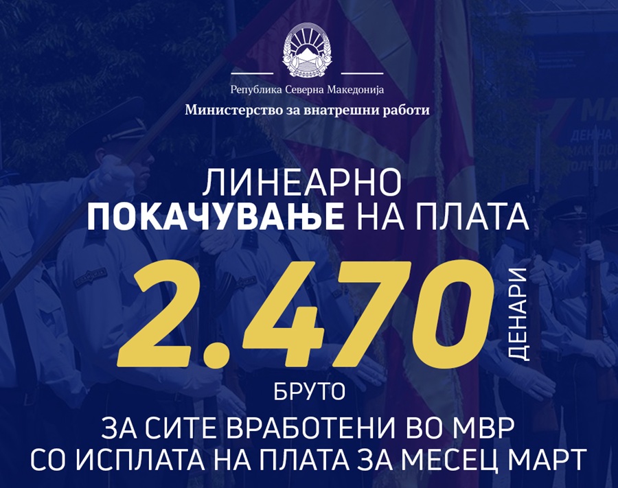 „Согласно објавениот нов податок за минимална плата, Министерството за внатрешни работи изврши линеарно покачување на платата за вработените во МВР во бруто износ од 2470 денари и тоа почнувајќи со исплата на плата за месец март 2026“, информира МВР на својот Фејсбук профил.