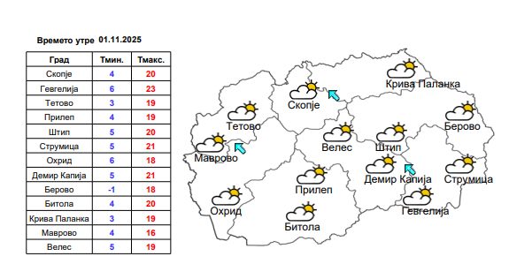 Во Берово утринската температура ќе биде под нулата. Најтопло ќе биде во Гевгелија, со дневна температура до 23 степени Целзиусови.