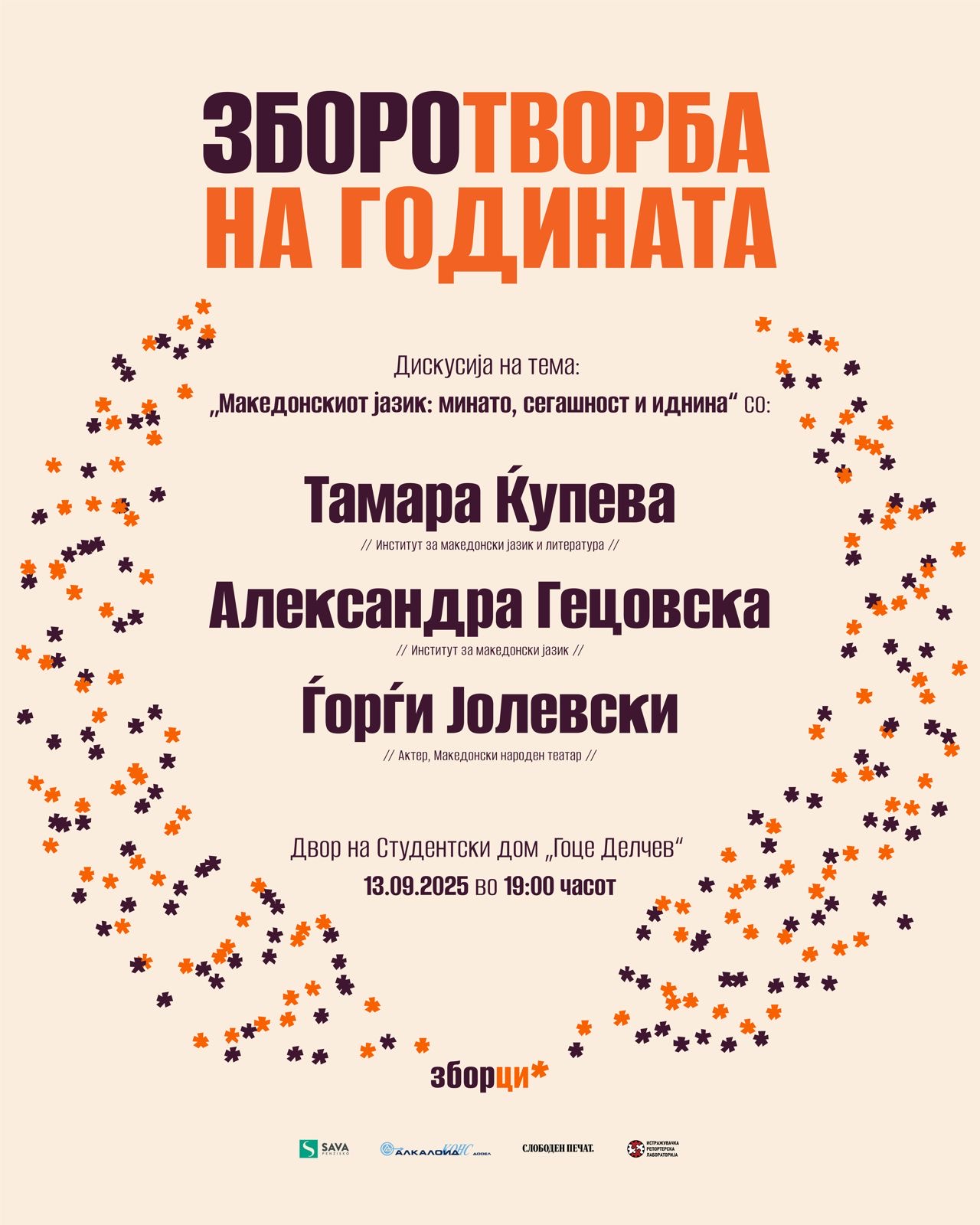 Здружението Зборци ја организира првата „Зборотворба на годината“, настан посветен на македонскиот јазик, креативноста и уметноста кој ќе се одржи на 13 септември (сабота) со почеток во 19:00 часот, во дворот пред студентскиот дом „Гоце Делчев“ во Скопје.